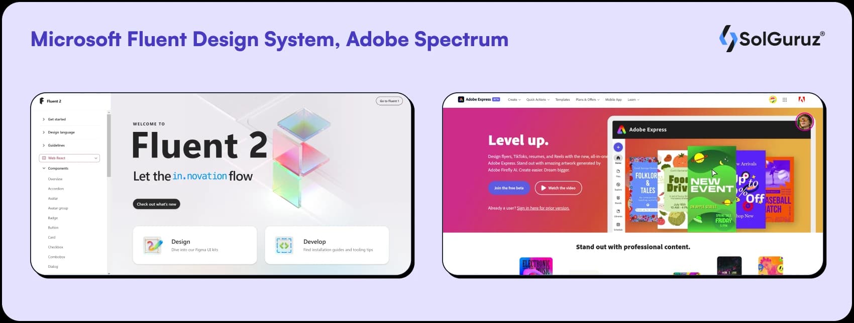 Microsoft Fluent Design System, which is now Fluent 2, and Adobе Spectrum are two distinct design systems developed by Microsoft and Adobе, respectively, to provide comprehensive guidance and tools for creating consistent and intuitive user experiences across their respective software platforms.